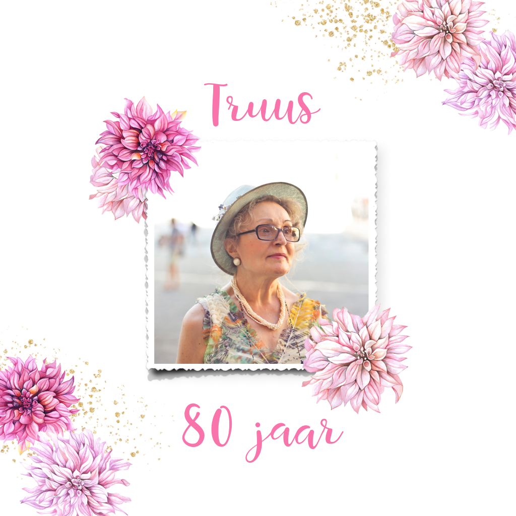 Verjaardags-uitnodiging voor vrouw die 80 wordt. De aquarel bloemen zien er chic en stijlvol uit. Plaats een foto van de jarige in het midden van de kaart.