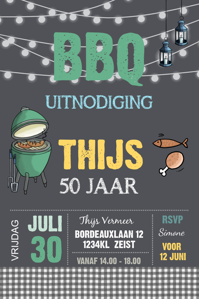 Hippe verjaardagsuitnodiging 50 jaar met barbecue en slingers