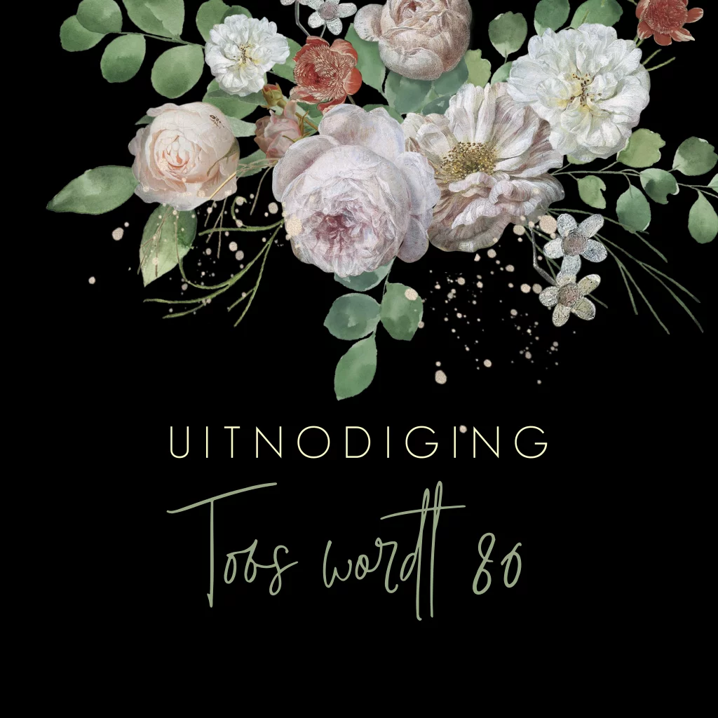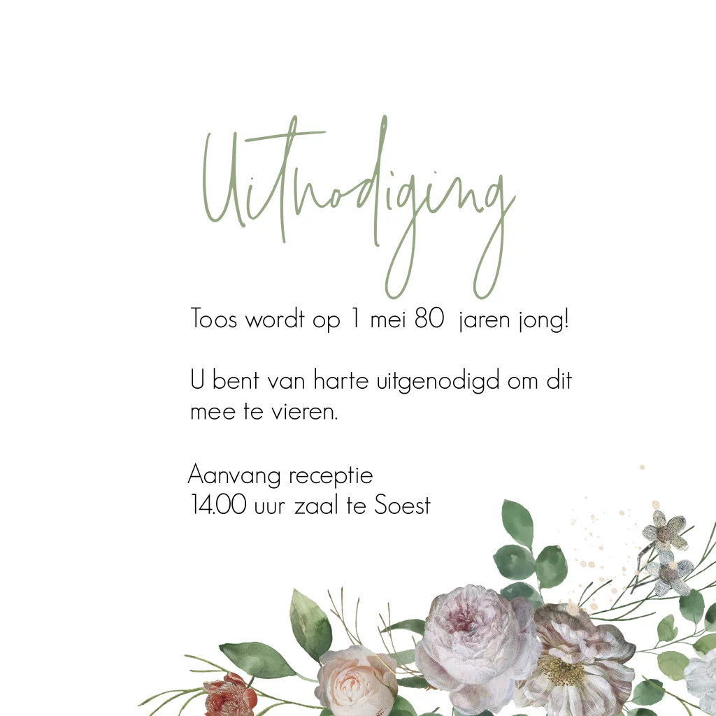 Uitnodiging voor 80e verjaardag met chique uitstraling. Mooi gedecoreerd met bloemend en een sierlijke lettertype.