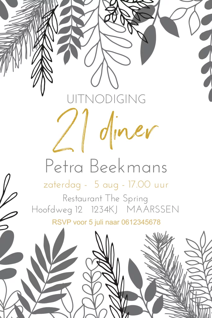 Hippe uitnodiging 21 diner met takjes in zwart wit