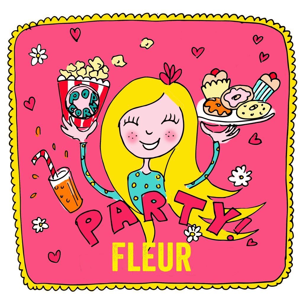 Vrolijke uitnodiging voor een feestje met een getekend meisje met popcorn en taartjes.