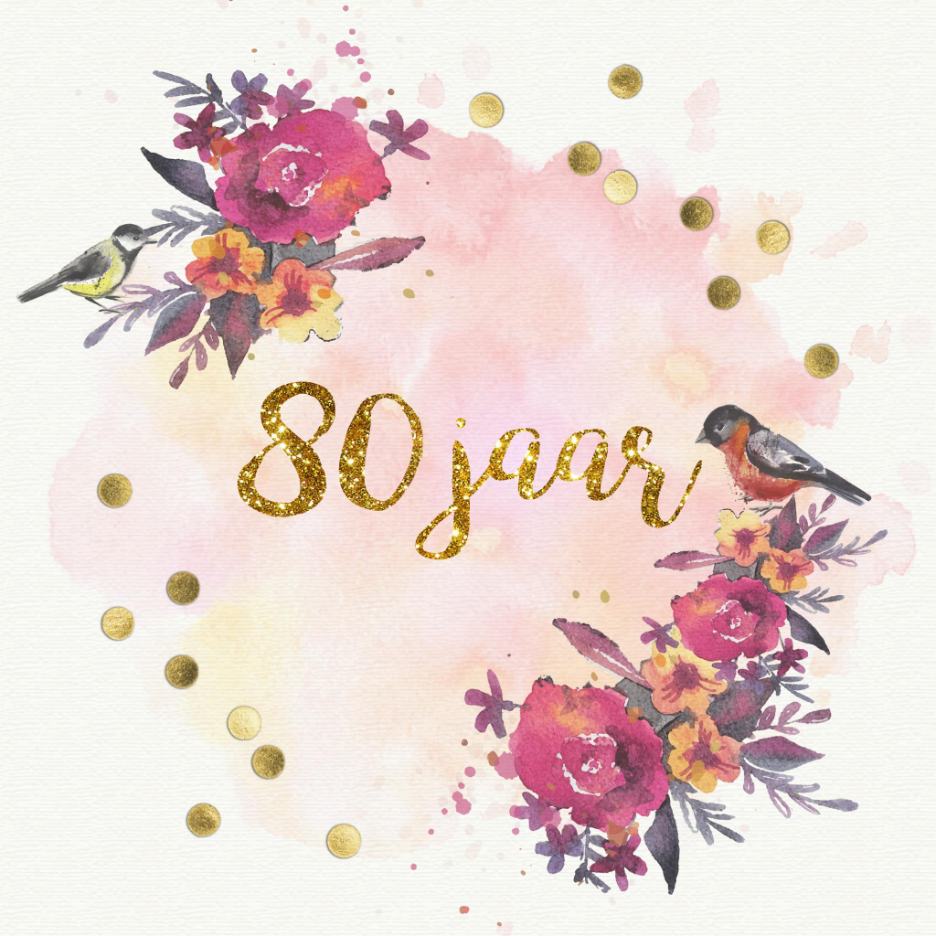 Vrolijke verjaardagsuitnodiging voor een 80e verjaardag. Met de schildering van rode en oranje bloemen, takjes en vogels, een roze waterverf vlek en goudkleurige confetti. Pas de teksten op de kaart aan en maak zo je eigen unieke ontwerp.