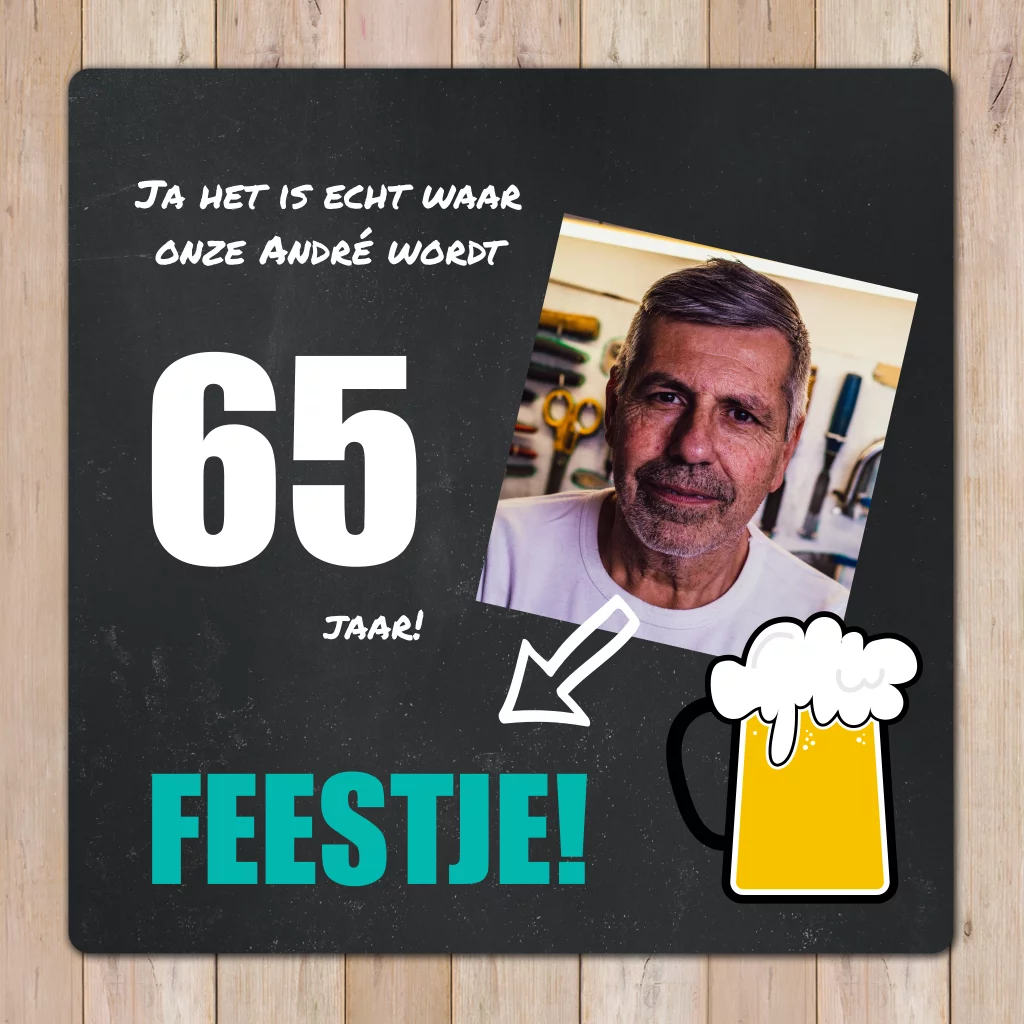 Wordt je 65 jaar? Dat moet gevierd worden. Pas deze uitnodiging zelf aan en schrijf je teksten op het krijtbord met de pul bier.