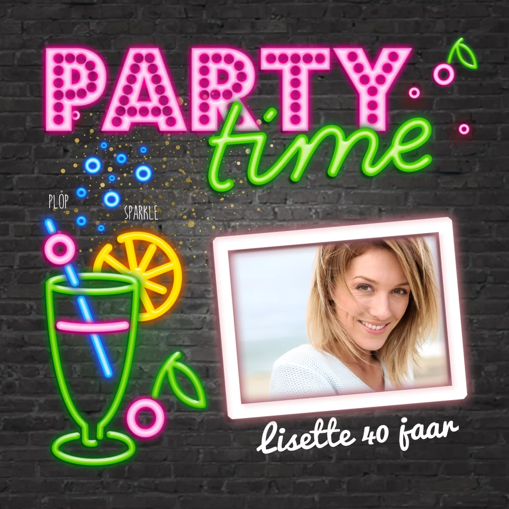 Wat een stoere en moderne uitnodiging voor een 40ste verjaardag! De tekst in neon kleuren en de cocktail glazen zijn heel feestelijk. De foto en de teksten kunnen makkelijk in de editor aangepast worden.