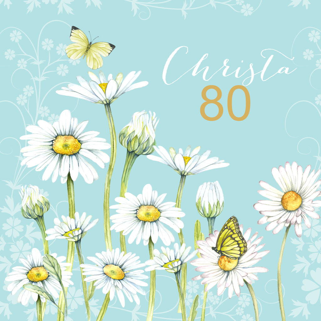 Mooie verjaardagskaart 80 jaar met magrietjes en vlinders