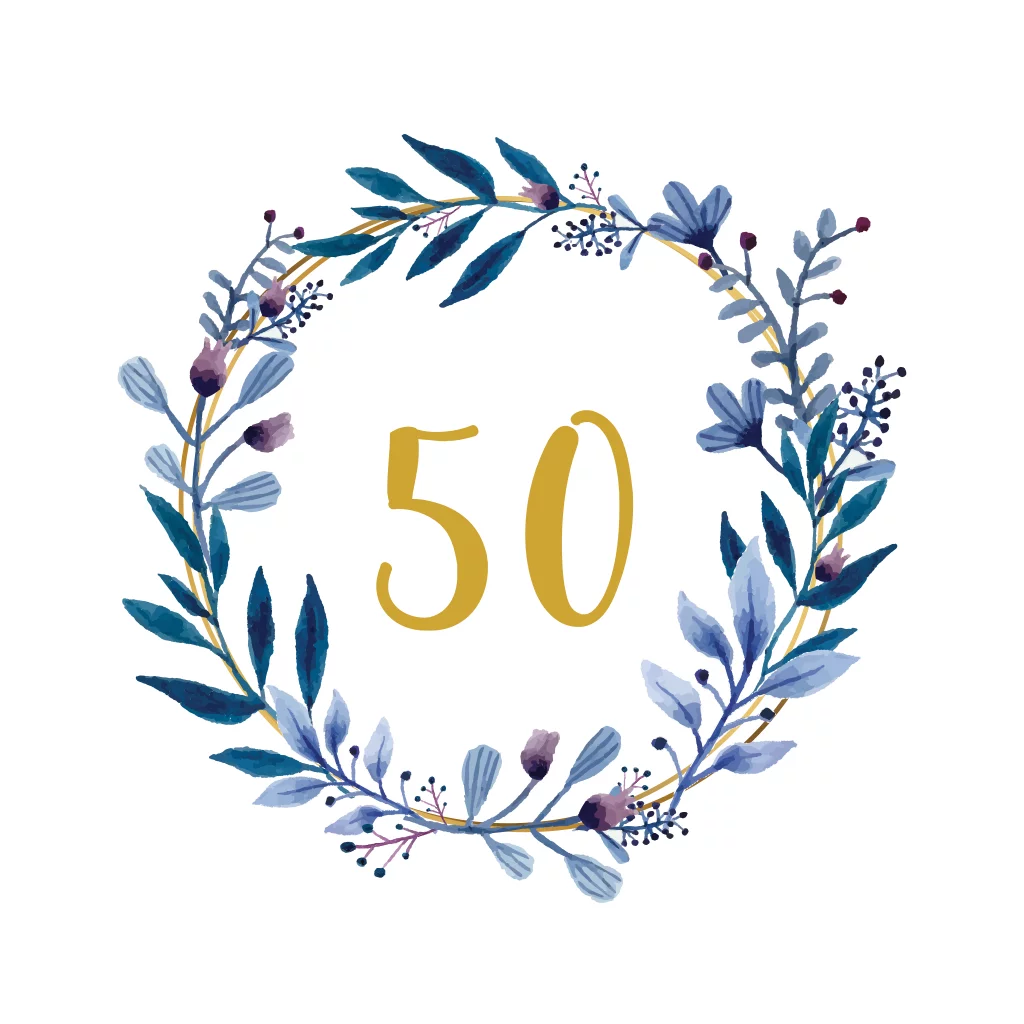 Stijlvolle uitnodigingskaart voor een 50e verjaardag met een krans van blauwe takjes en bloemen. In het midden staat een goudkleurige 50. Pas de teksten op deze kaart eenvoudig aan in de online editor.