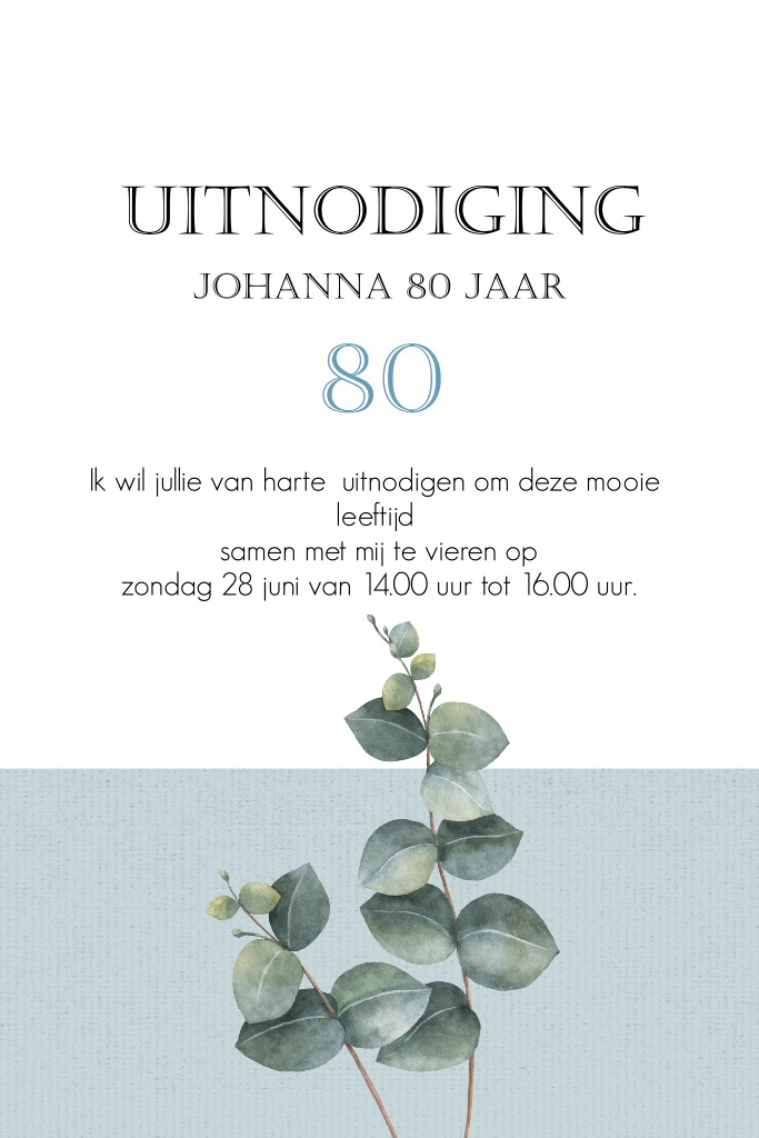 Stijlvolle uitnodiging 80 jaar vrouw met eucalyptus
