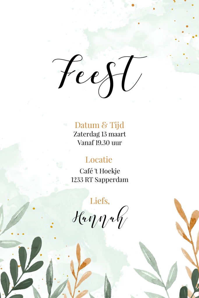 Trendy verjaardagsuitnodiging met groene en bruine takjes van waterverf. Op de achtergrond staan mintgroene aquarel vlekken. Pas de teksten op de kaart eenvoudig aan in de online editor.