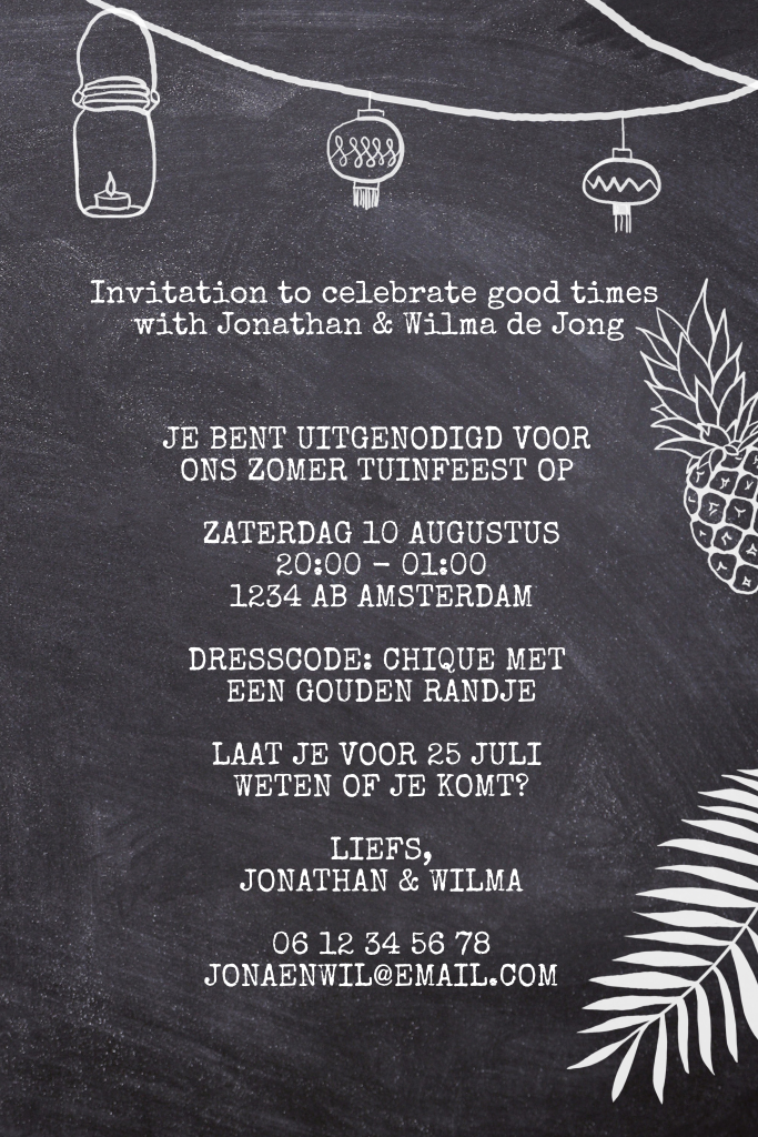 Stoere uitnodigingskaart voor een summer party, met illustraties van cocktails, lampions en slingers op een krijtbord achtergrond.