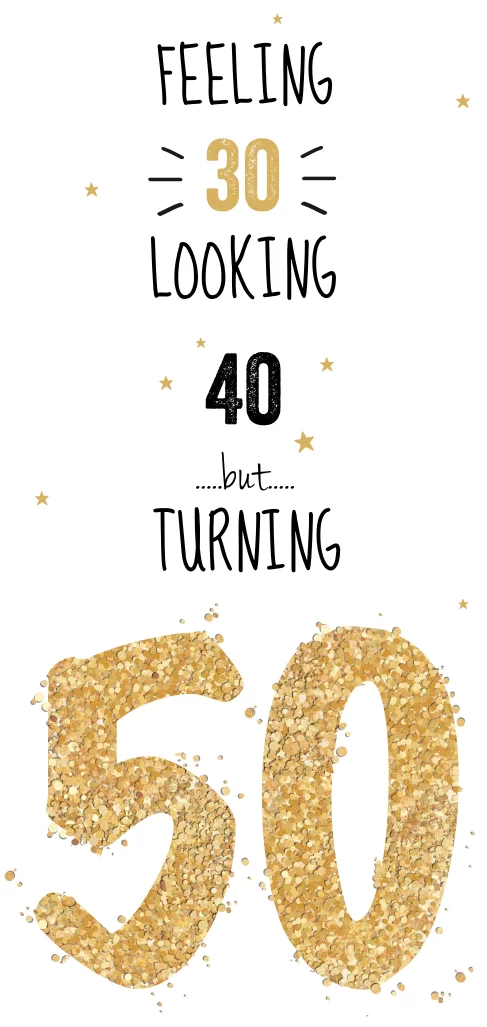 Vrolijke uitnodiging verjaardag in zwart wit met goud en het cijfer 50 in gouden confetti.