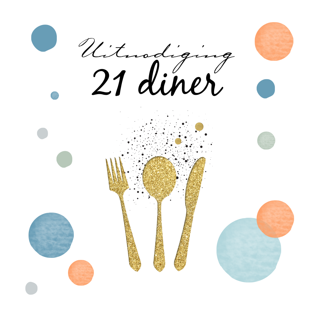 Uitnodiging voor 21 diner met gekleurde confetti en gouden bestek