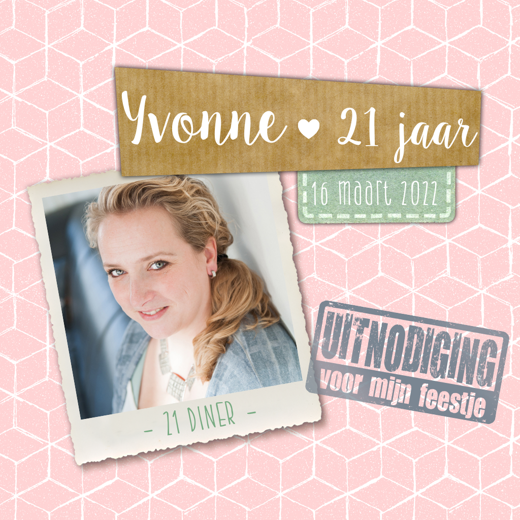 Hippe verjaardagsuitnodiging voor een 21 diner met polaroidfoto, labels en stempel. De achtergrond van de kaart heeft een leuk patroon met roze blokjes. Voeg gemakkelijk je eigen foto toe en pas de teksten aan in de online editor.
