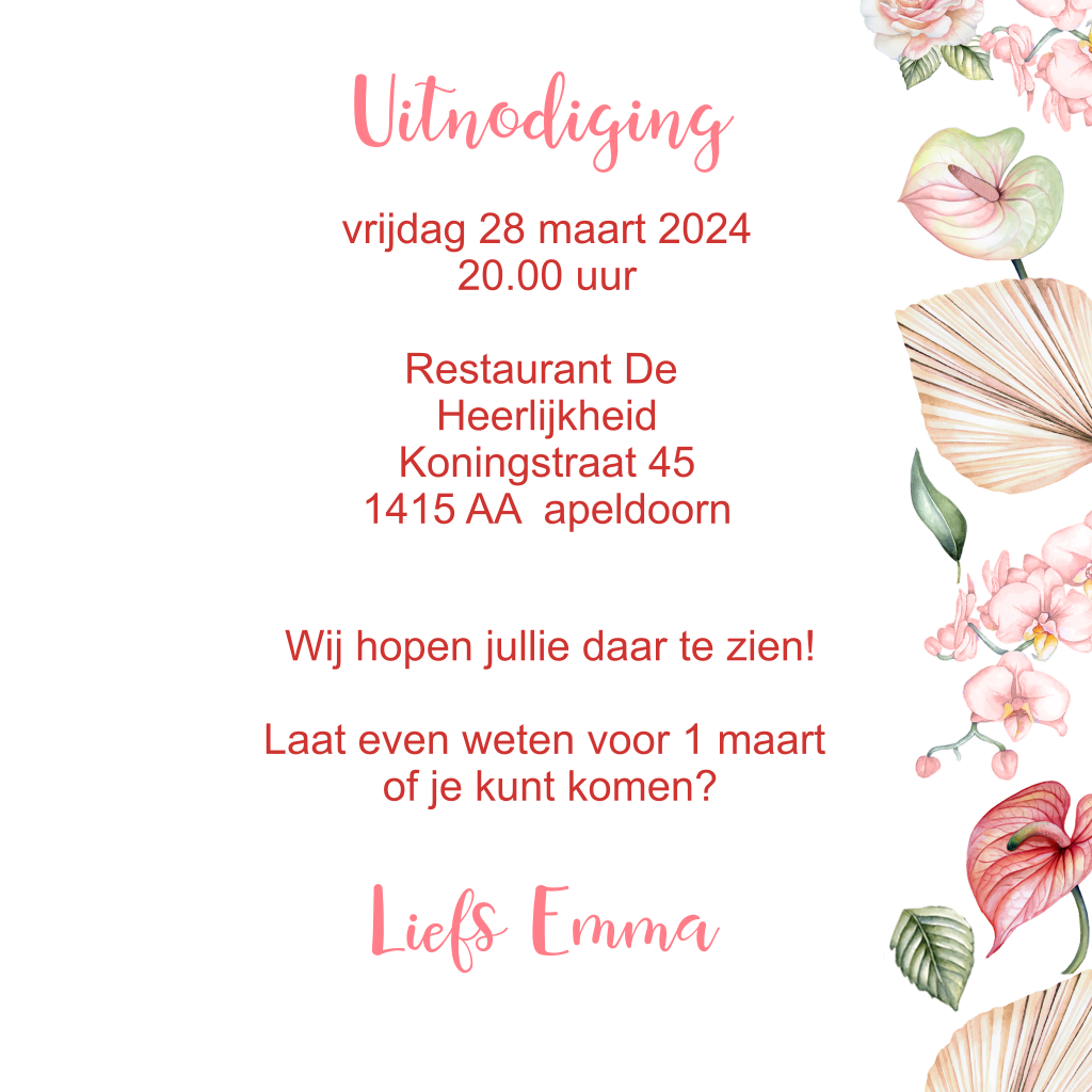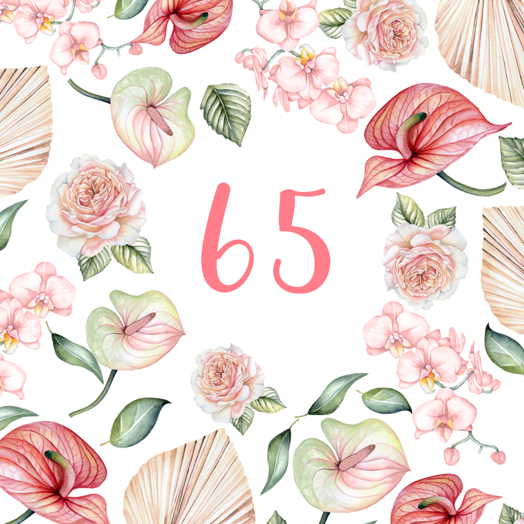 Vrolijke uitnodigingskaart voor de 65e verjaardag van een vrouw. Met kleurrijke illustraties van roze bloemen, rozen en groene blaadjes op een witte achtergrond. De leeftijd op deze kaart is ook zelf aan te passen naar een andere leeftijd.