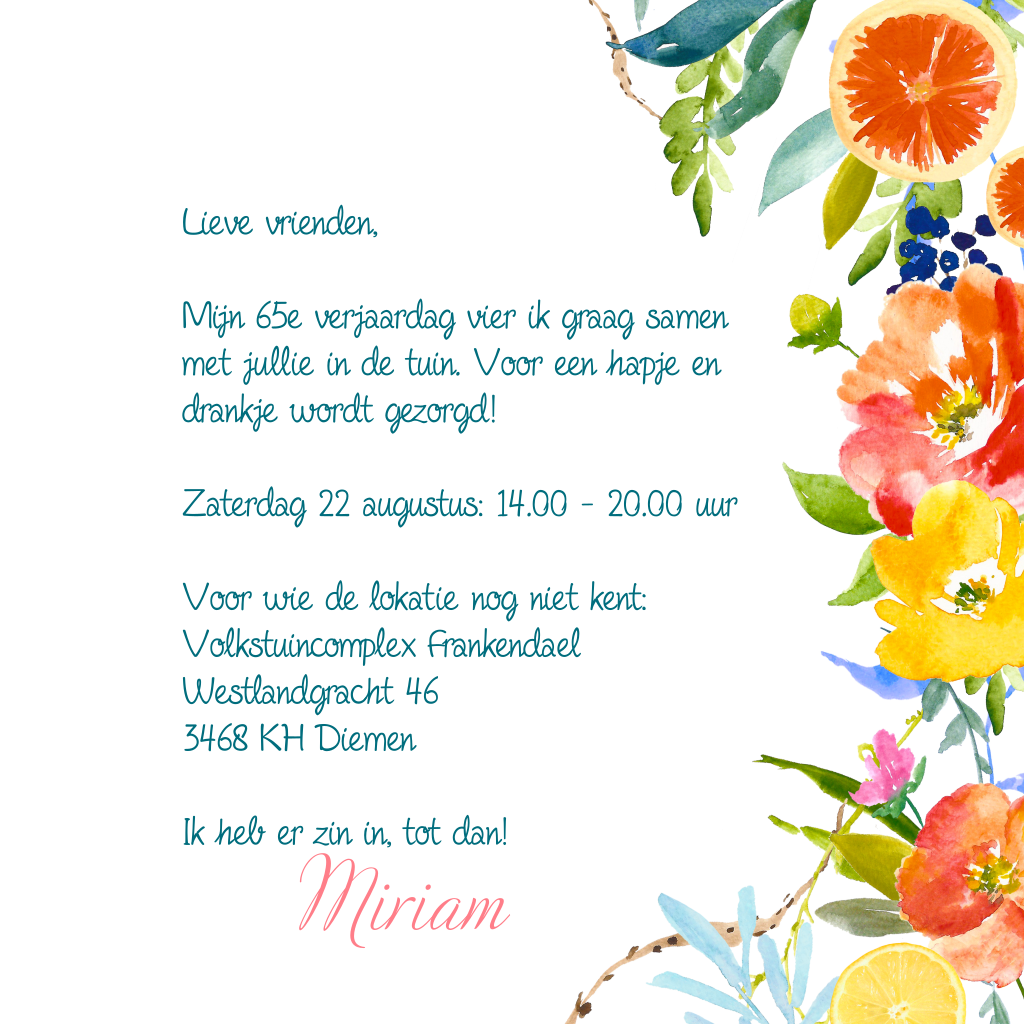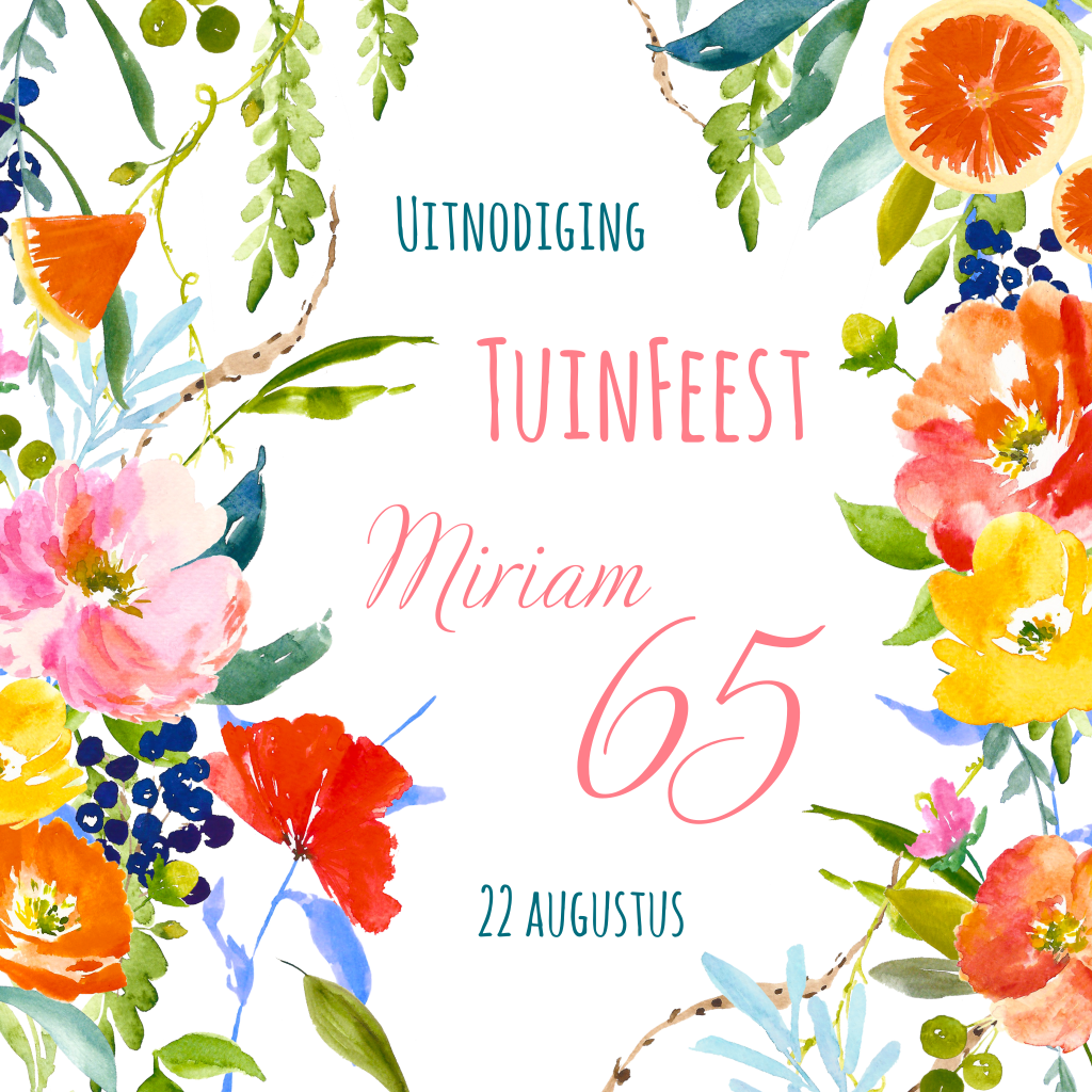 Gezellige en fleurige uitnodiging voor je verjaardag of tuinfeest. Alle tekst en de leeftijd kan aangepast worden. Met foto aan de binnenkant.