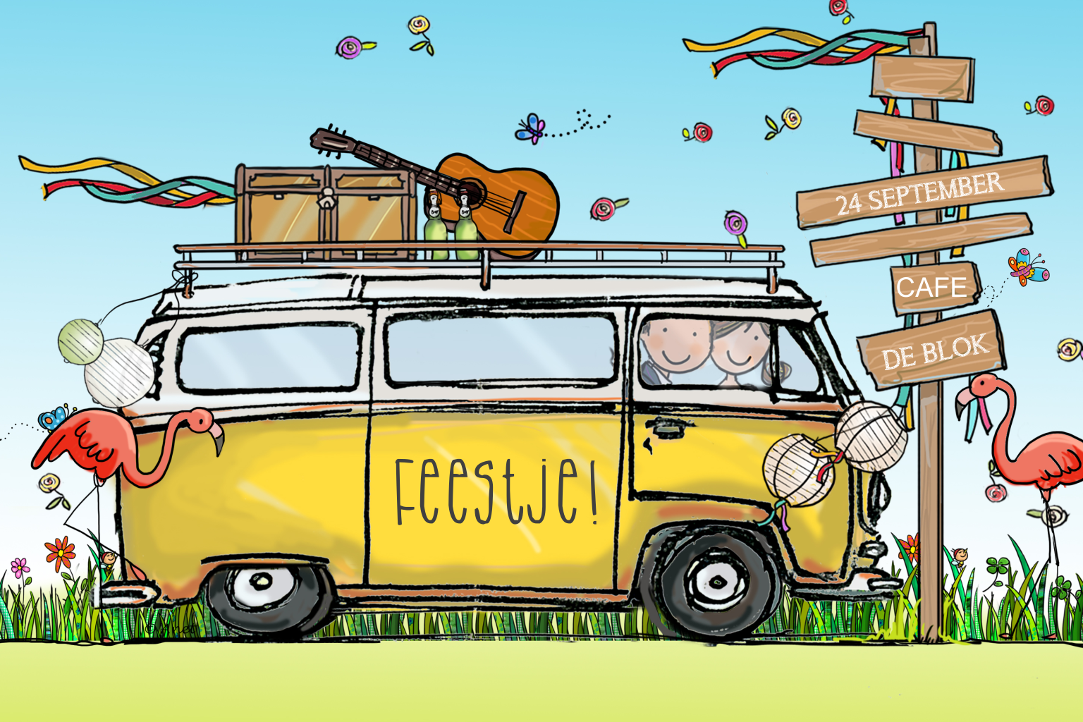 Wat een super leuk uitnodigingskaart! Het busje met de guitar, lampionnen en bloemen geven aan deze kaart een feestelijke uitstraling.