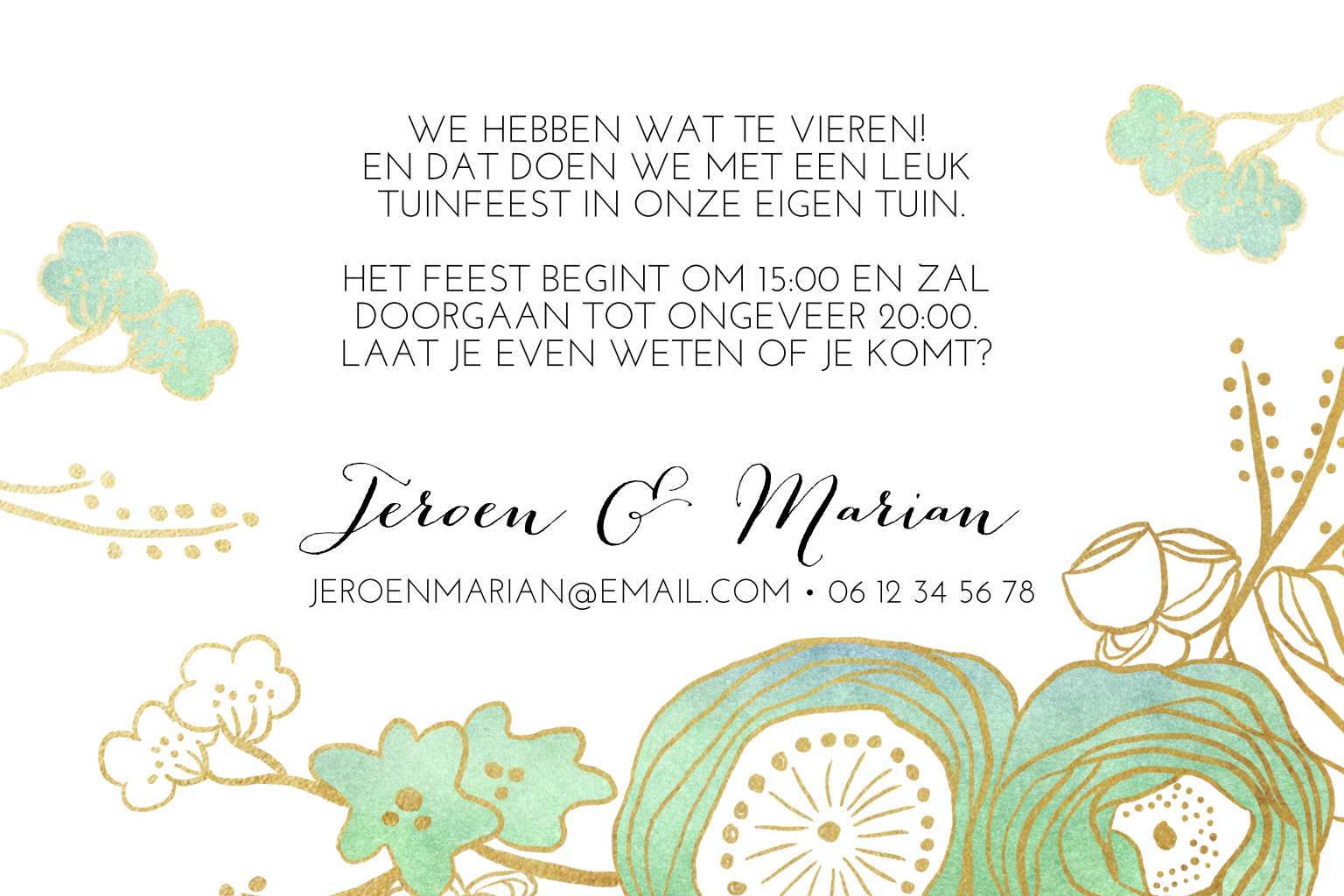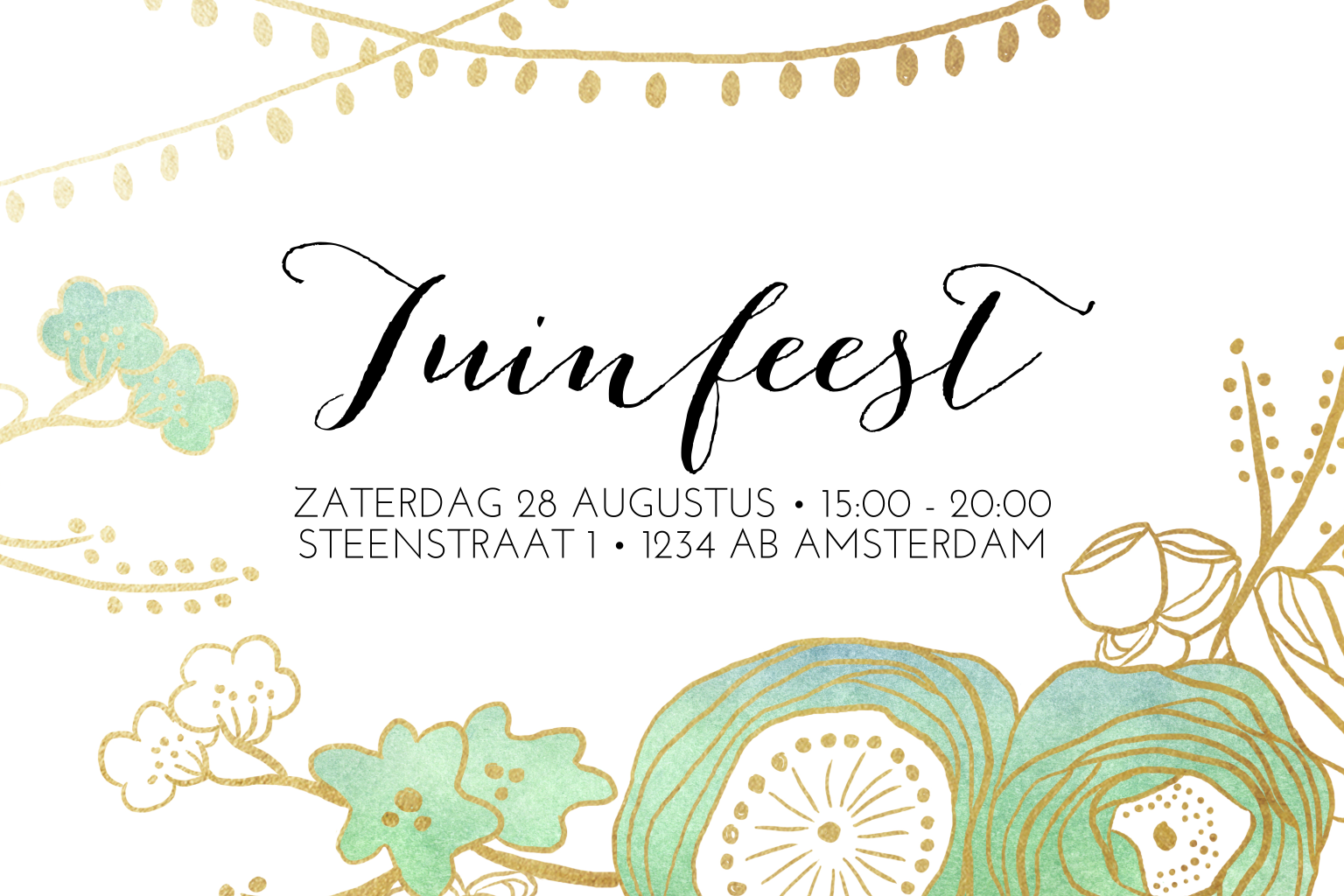 Tuinfeest uitnodiging met getekende tuin en lampjes-slinger