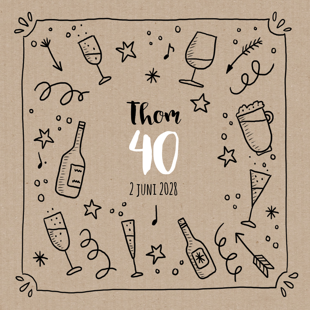 Stoere kraft uitnodiging voor de 25e verjaardagsfeest van een man. Met vrolijke illustraties van wijn, cocktails, champagne, slingers en sterretjes is dit echt een hippe verjaardagskaart!