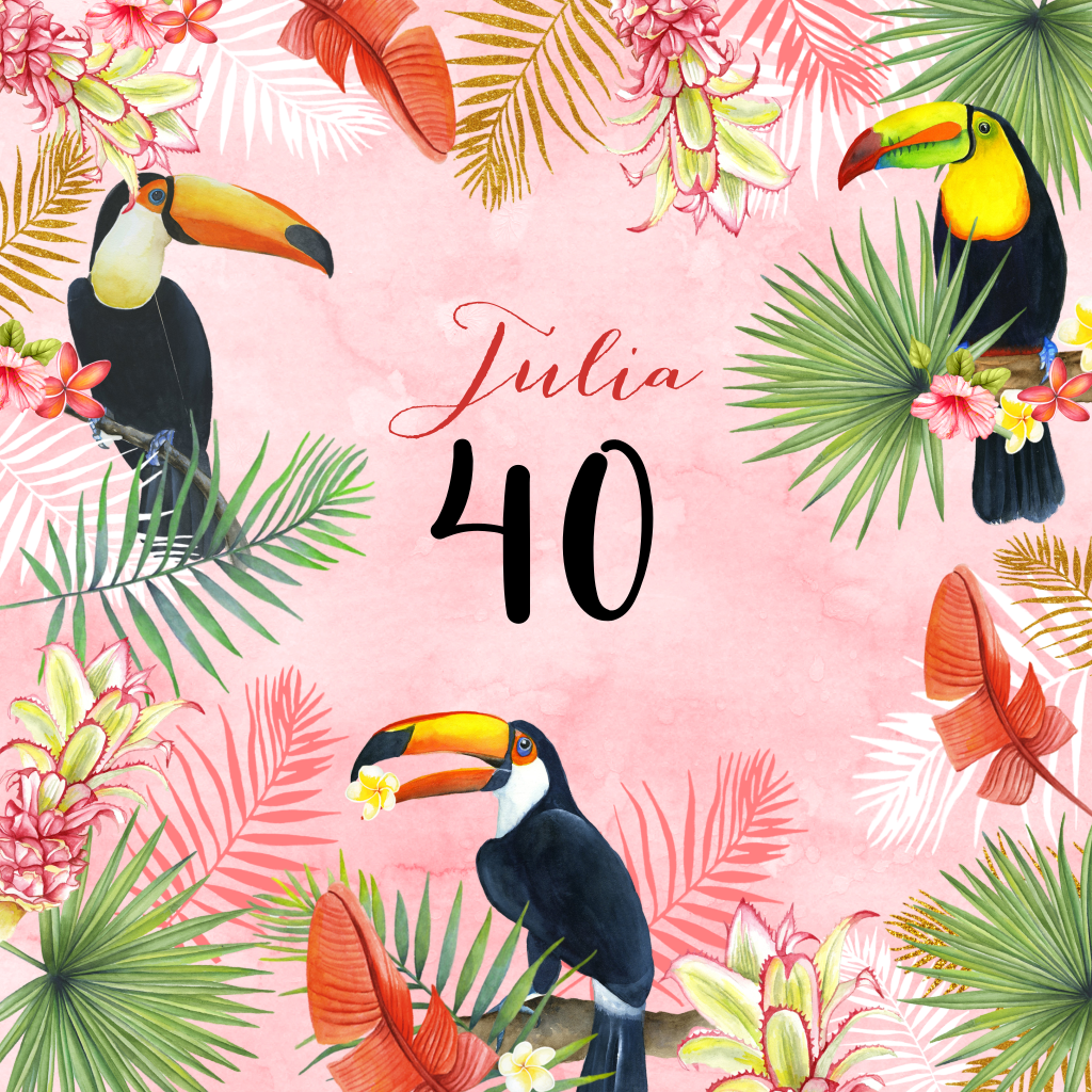 Hippe botanische uitnodiging voor je 40e verjaardag met jungle bladeren en toekan vogels op een roze watercolor achtergrond. Deze verjaardagsuitnodiging past helemaal in de huidige jungle trend!