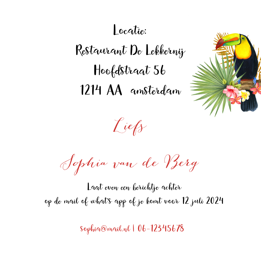 Uitnodiging 40e verjaardag van vrouw met botanische takken en toekan