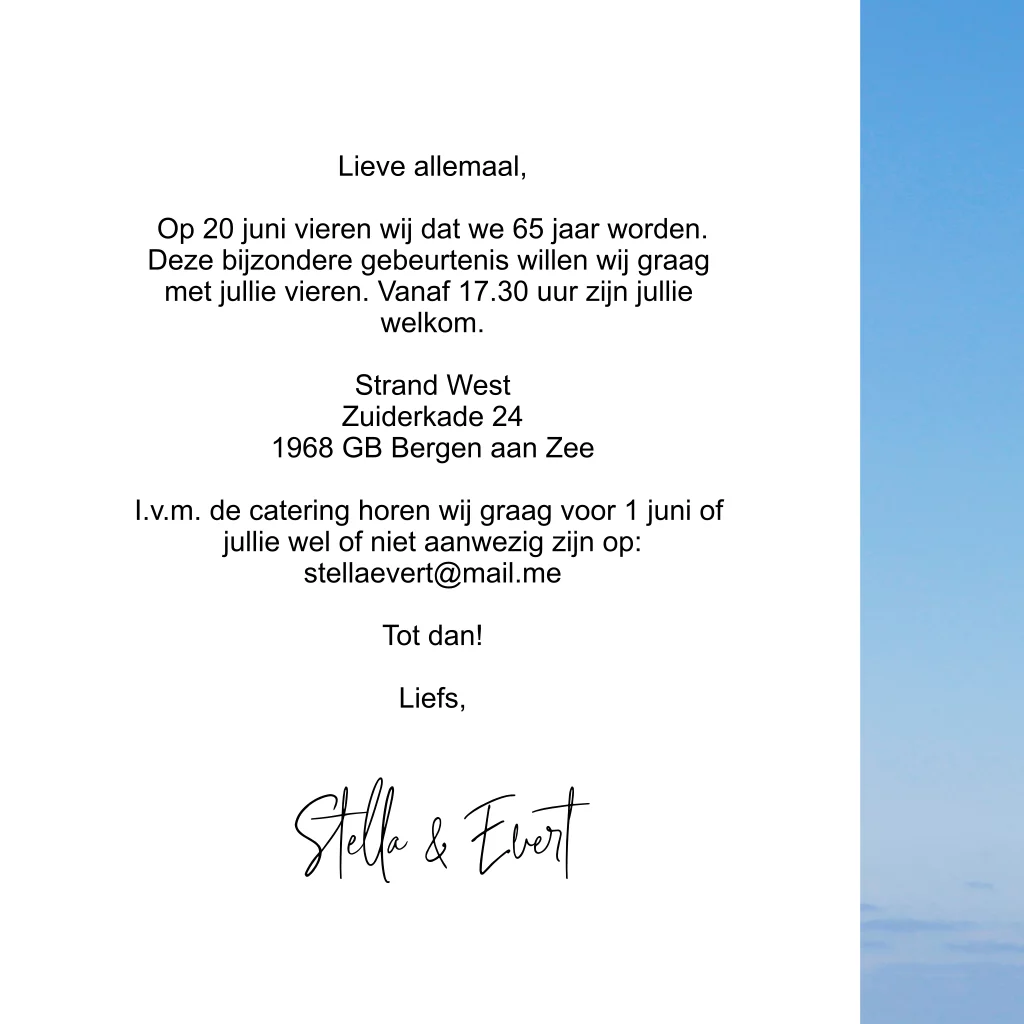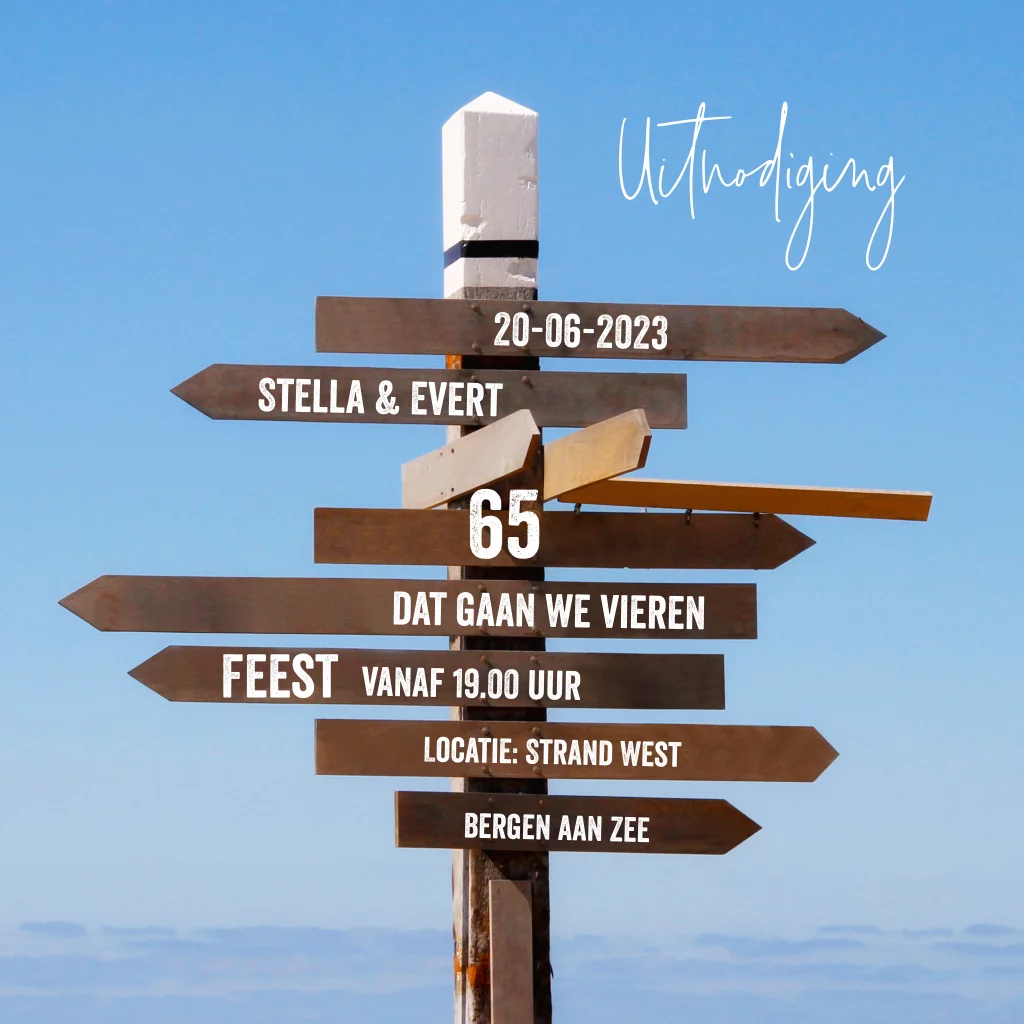 Uitnodiging verjaardag met houten wegwijzer op blauwe lucht