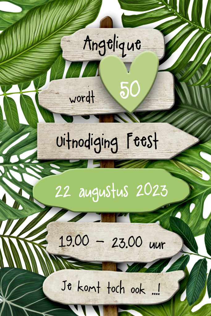 Trendy uitnodiging met diverse botanische bladeren en een houten wegwijzer. Hip, vlot en fris. Alle tekst op de bordjes is aan te passen en het hartje is te verschuiven.