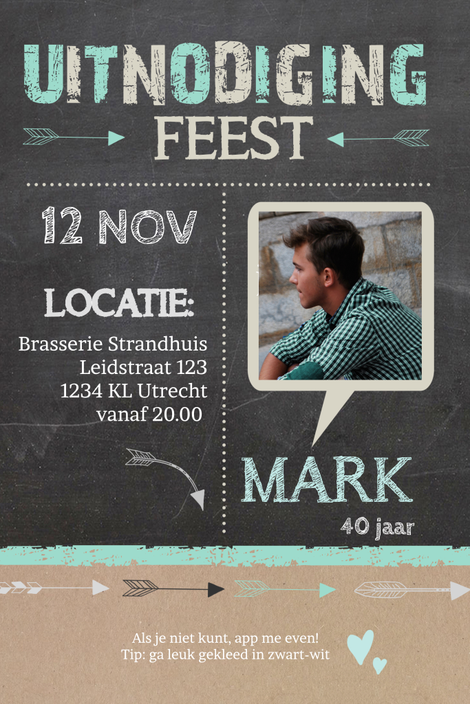 Stoere 40e verjaardag uitnodiging met foto op krijtbord
