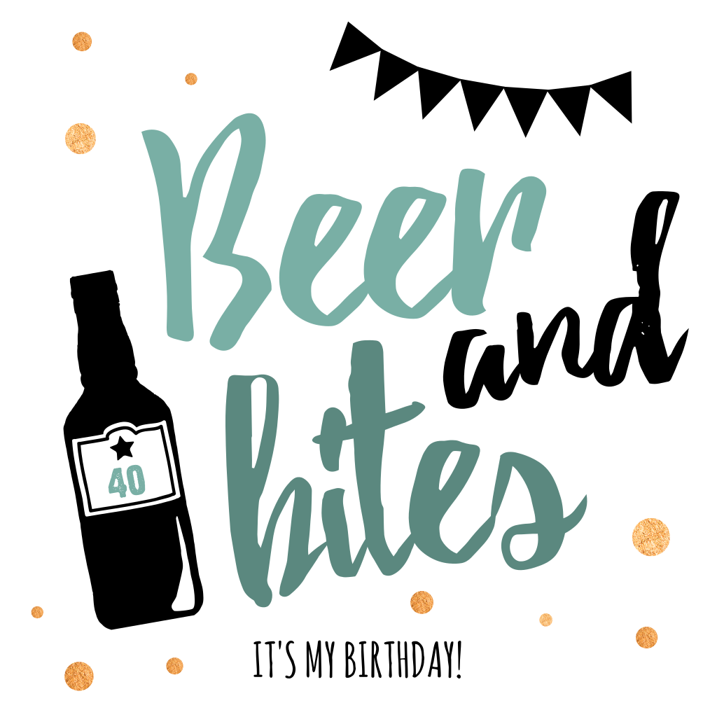Gefeliciteerd met je verjaardag! Stuur deze stoere verjaardagsuitnodiging naar je vrienden en familie en nodig ze uit voor je verjaardagsfeest! Met op de voorkant "Beer and bites", koperkleurige stipjes, bier flesje en slingers.