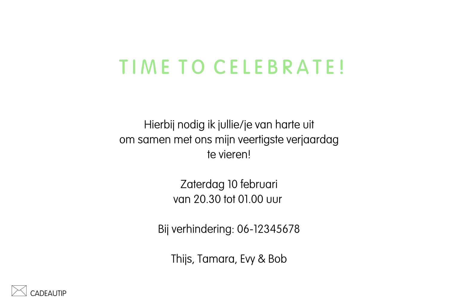 Feestelijke uitnodiging voor je 40e verjaardagsfeest met groene vlakken met strepen en stipjes met daarin ruimte om je eigen foto te plaatsen. Pas de teksten aan, verander de foto en stuur naar je vrienden en familie!