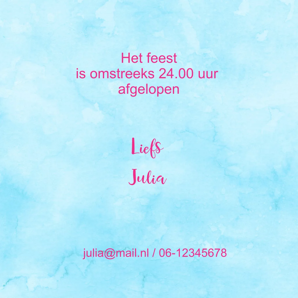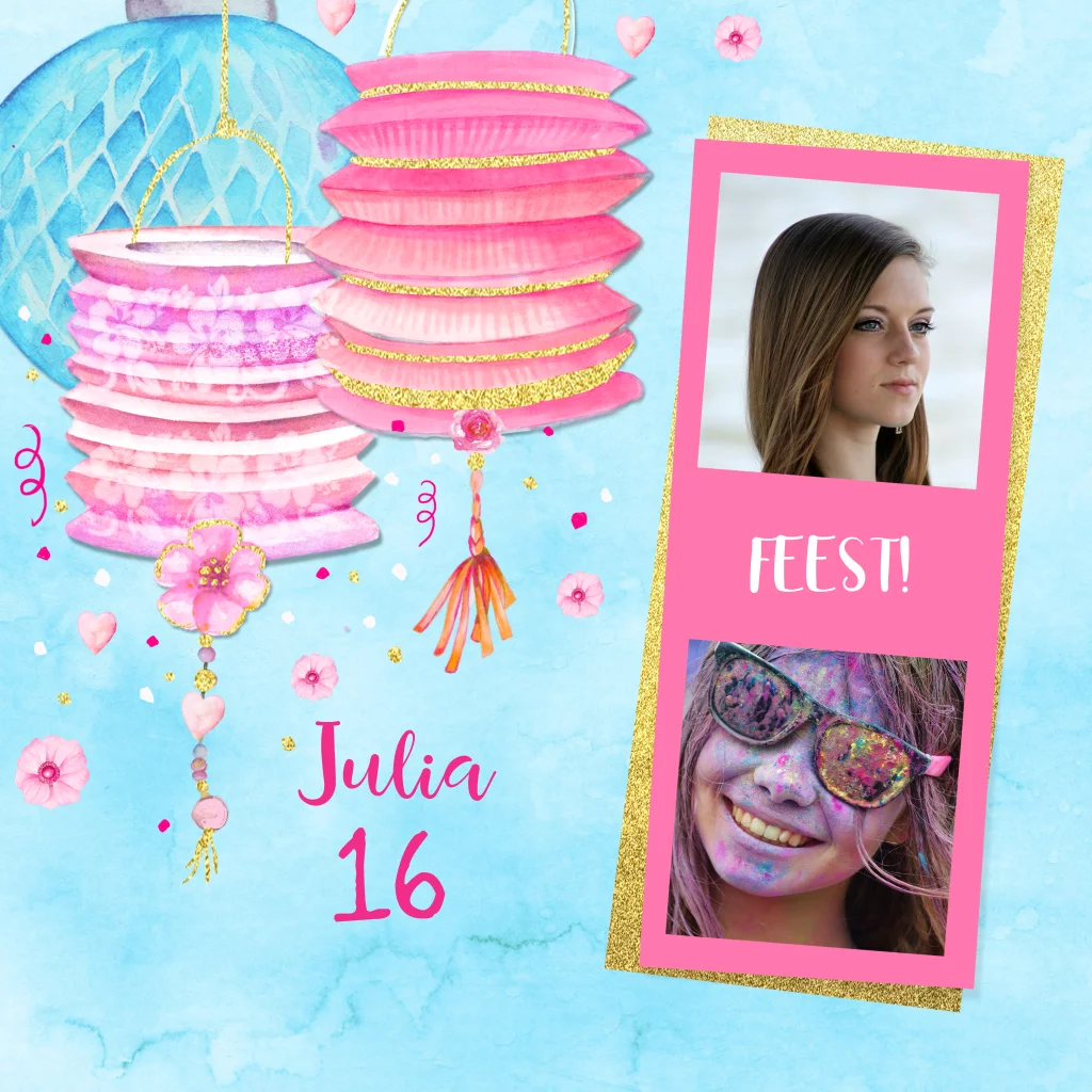 Feestelijke uitnodiging voor je 16e verjaardag! Met hippe lampionnen van roze waterverf op een blauwe bloemetjes achtergrond. Plaats twee mooie foto's van jezelf in de roze polaroid foto strip en maak een unieke uitnodiging!