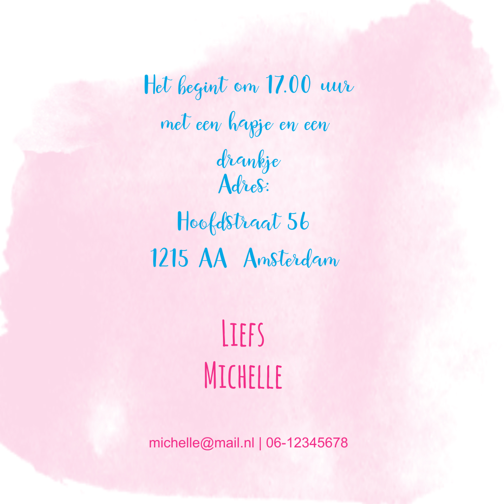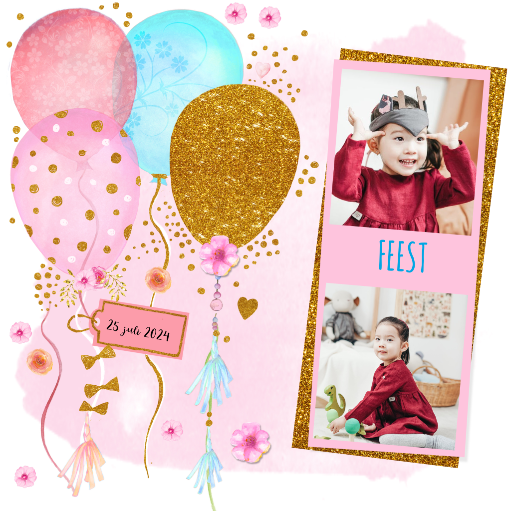 Uitnodiging voor een verjaardagsfeest van een meisje. Met roze watercolor, ballonnen en goudlook details en fotostrip.