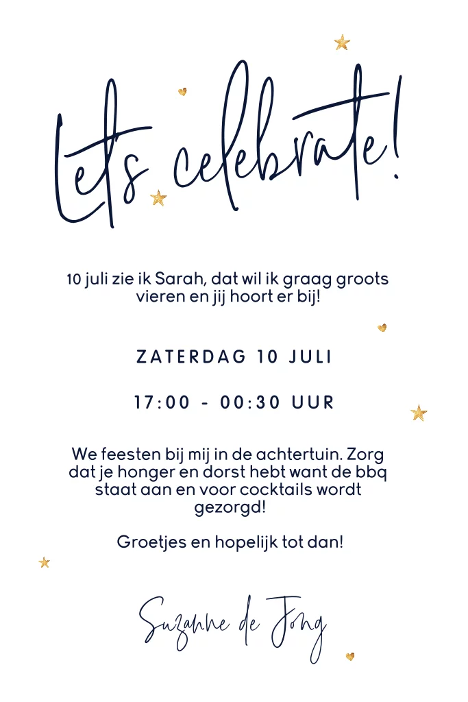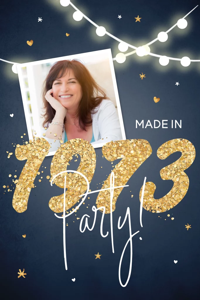 Een vrolijke uitnodiging voor een 50e verjaardagsfeest met het geboortejaar in gouden confetti cijfers en gezellige lampjes. Plaats je eigen foto op de voorzijde en maak zo eenvoudig een persoonlijke uitnodiging.