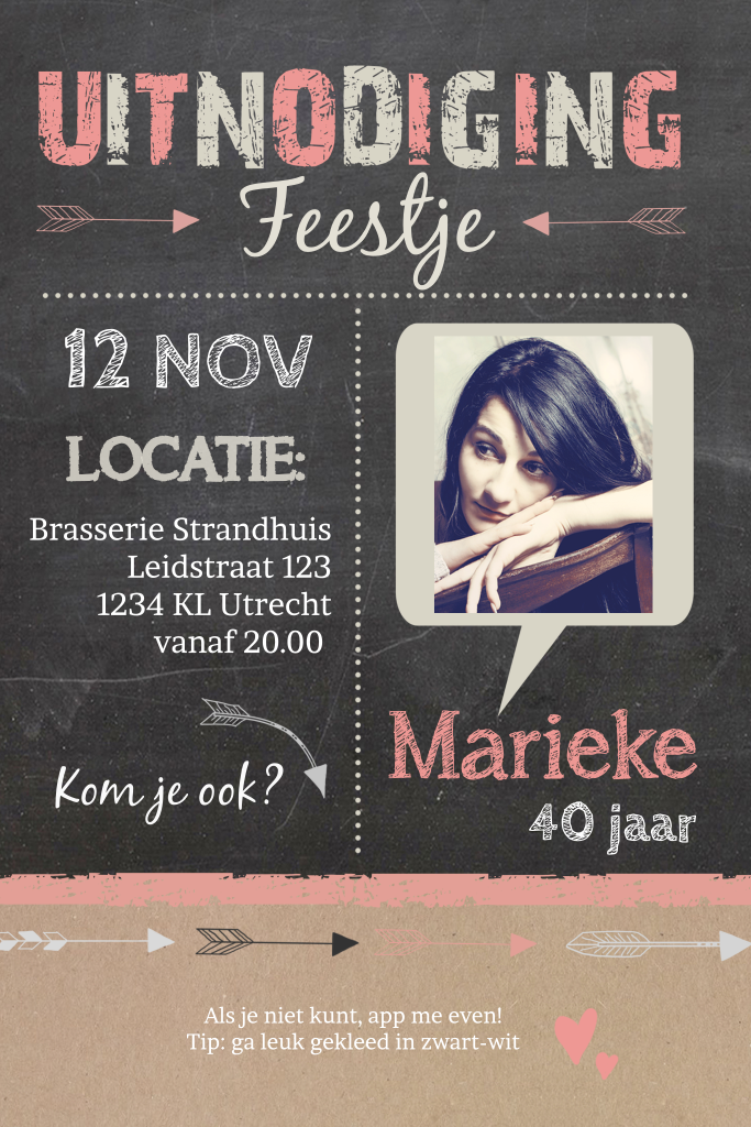 Stoere uitnodigingskaart voor een 40ste verjaardag. Leuke typografie op krijtbord en kraftlook achtergrond. De foto en de tekst kunnen naar wens aangepast worden.