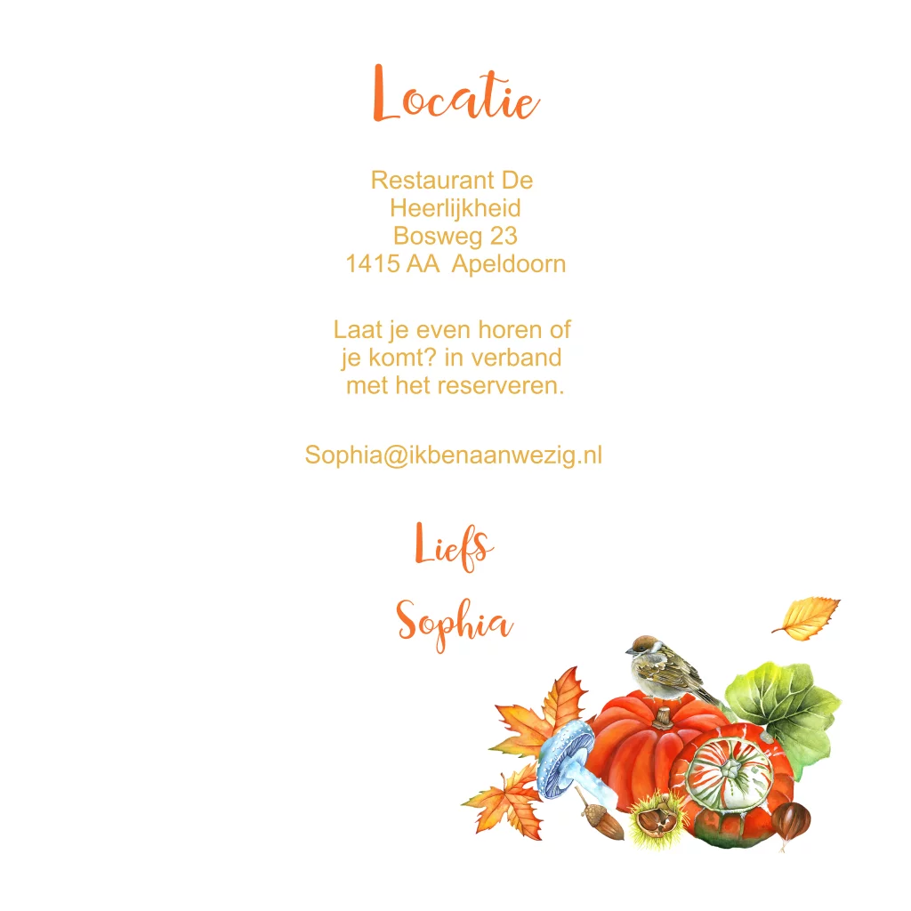 Ben je in herfst jarig? Deze kaart is perfect voor jou. Uitnodigingskaart met herfsttafereel van kalebas en vogels. De kleuren en de teksten kunnen in de editor aangepast worden. Combineer deze kaart met een mooie oranje envelop.