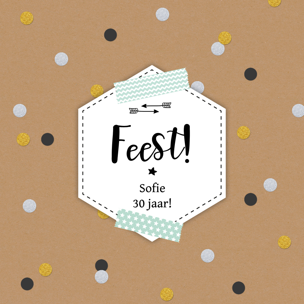 Wat een hip verjaardagskaartje met een achtergrond van kraftkarton en confetti in zilver, goudkleur en zwart! Met het geometrische label en de plaktape met patroontjes is dit vierkante uitnodigingskaartje helemaal compleet. Voeg je eigen teksten toe en maak dit kaartje af. Het feest kan beginnen!