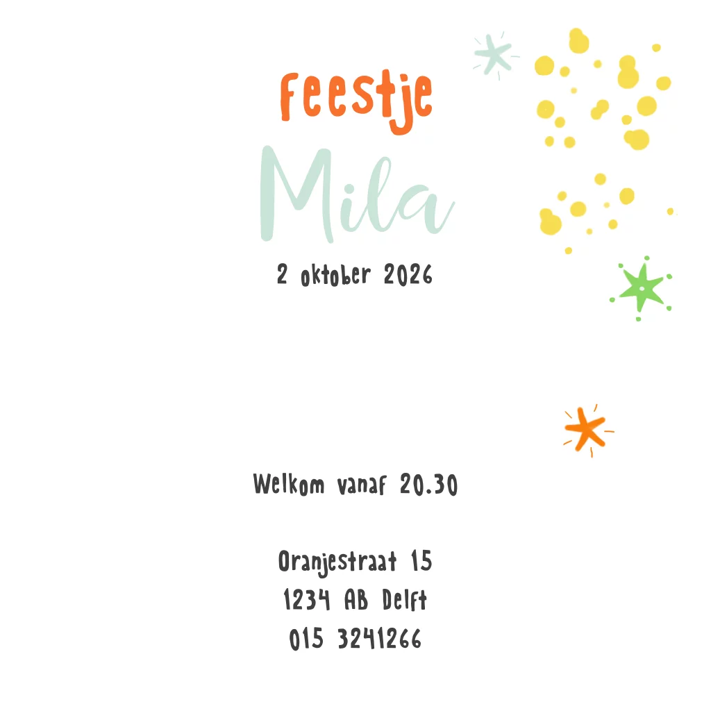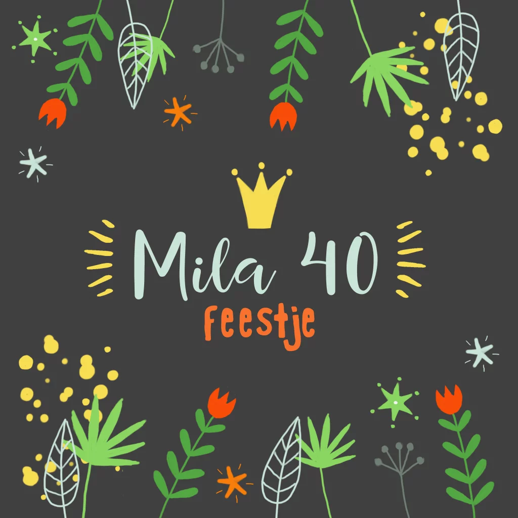 Een hippe en vrolijke uitnodigingskaart met kroon, takjes, bloemen en sterren. Pas de kleuren en de tekst in de editor aan.