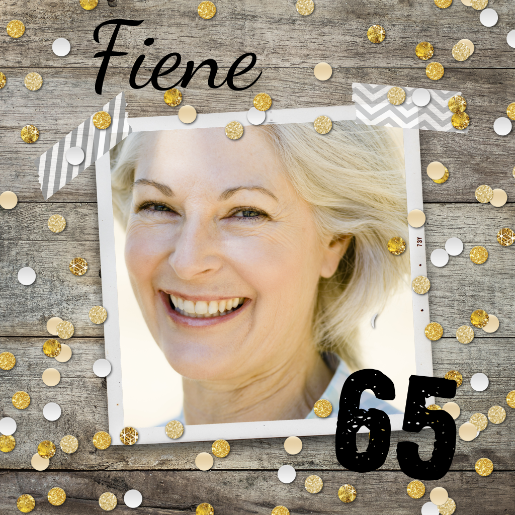 Hippe uitnodiging met een foto en gouden confetti op een achtergrond van steigerhout.