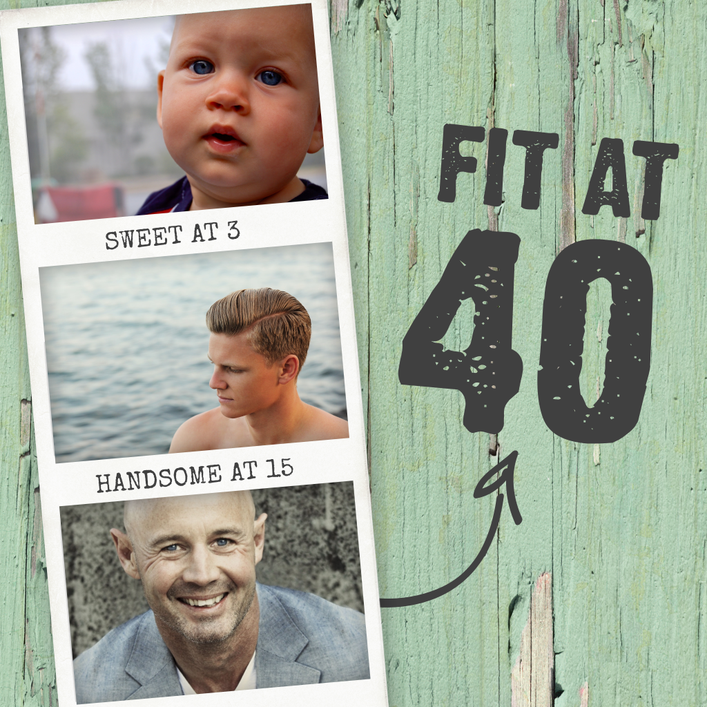 Een mintgroene houtachtergrond met fotoframe, super hip! Sweet at 3, handsome at 15 and fit at 40! Geldt dit ook voor jou? Haal je oude foto's er weer eens bij en creëer een grappige en persoonlijke uitnodigingskaart.