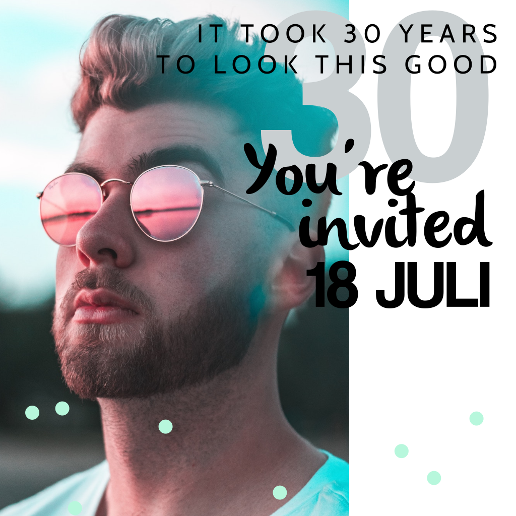 30 jaar en tijd voor een feest? Met deze fancy uitnodigingskaart met vrolijke, mintgroene stippen kun je je vrienden hiervoor uitnodigen. De tekst op de voorkant maakt dit een grappige kaart. Voeg een coole foto toe op de voorkant en dit kaartje is helemaal compleet!