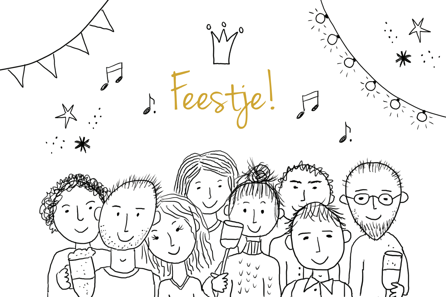 Een vrolijke uitnodigingskaart met tekeningen van mensen, slingers, lampjes en muzieknootjes. Het feest kan beginnen!