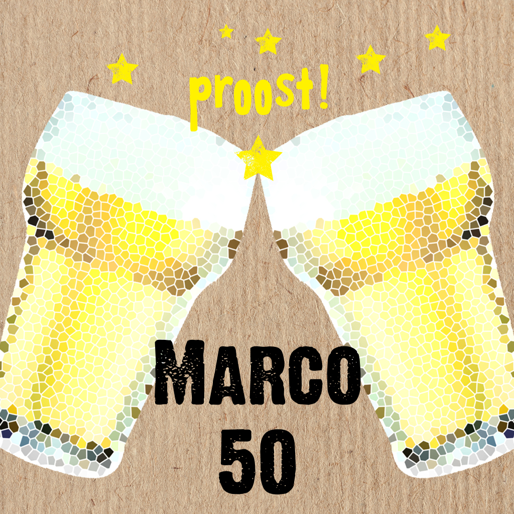 Stoere uitnodiging met twee biertjes en sterren op een achtergrond van kraft. Op de achterzijde een schoolbord met tekst.