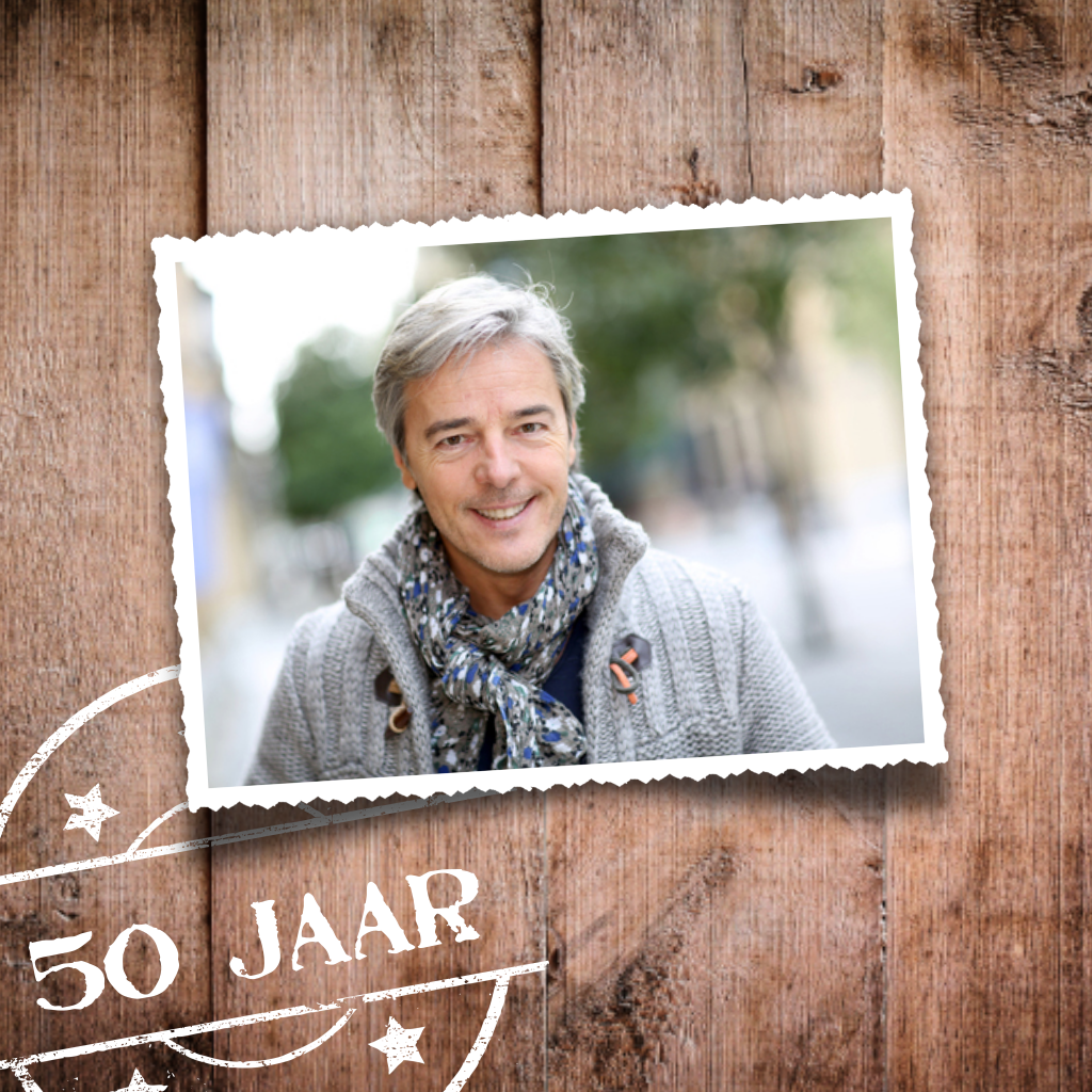 Stoere verjaardagsuitnodiging voor een 50e verjaardag met eigen foto in wit kader. Op de achtergrond van de kaart staan houten planken en een witte stempel. Pas de teksten op de kaart aan en maak zo je eigen unieke ontwerp.