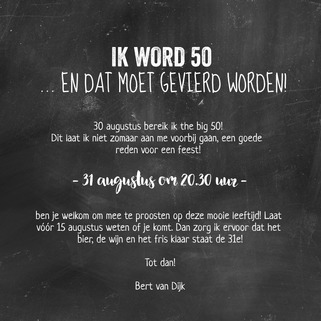 Een gezellige verjaardagsuitnodiging voor je vijftigste verjaardag met een biertje en vrolijke typografie op een krijt achtergrond.