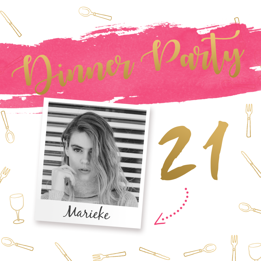 Stijlvolle uitnodiging 21 diner met foto en goudlook tekeningen