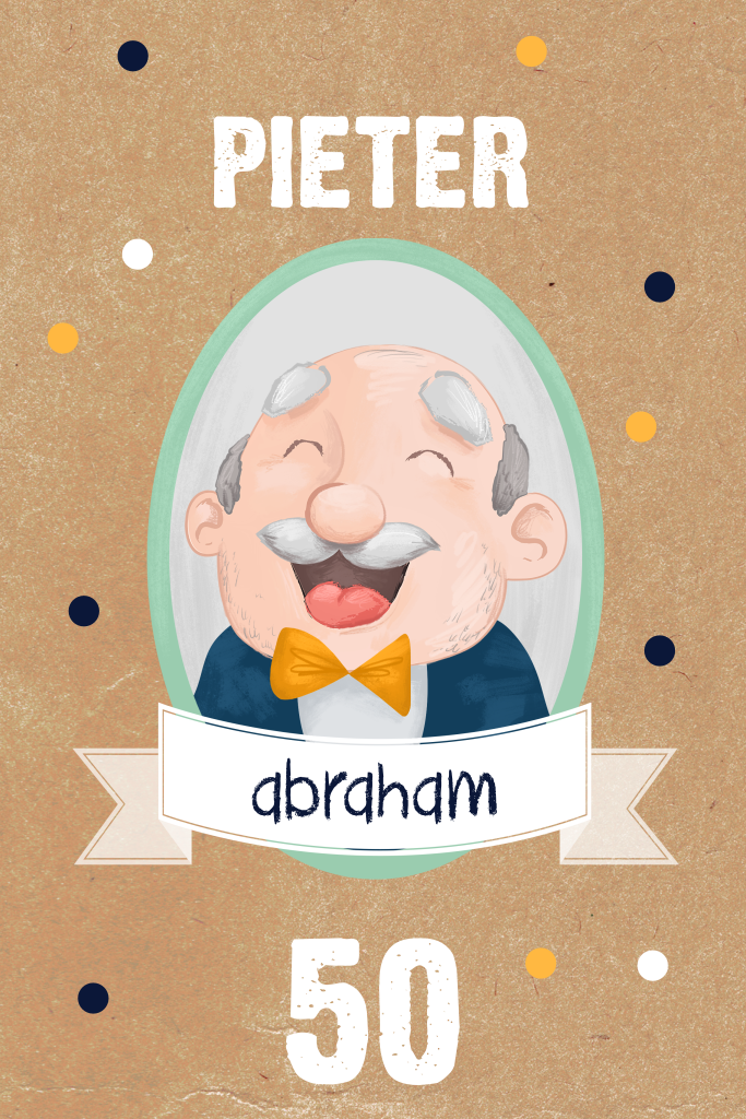 Feestelijke uitnodiging voor je 50e verjaardag. Met illustratie van Abraham op een kraft-look achtergrond en hippe confetti. Deze uitnodiging is extra mooi op papiersoort oud-hollands.