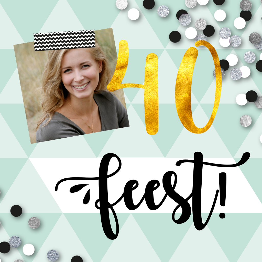 Deze hippe verjaardagskaart heeft een strak, modern achtergrondpatroon en een foto met plaktape met een zwart-wit patroon. De goudkleurige 40 en de confetti-stippen maken dit kaartje stijlvol en feestelijk!