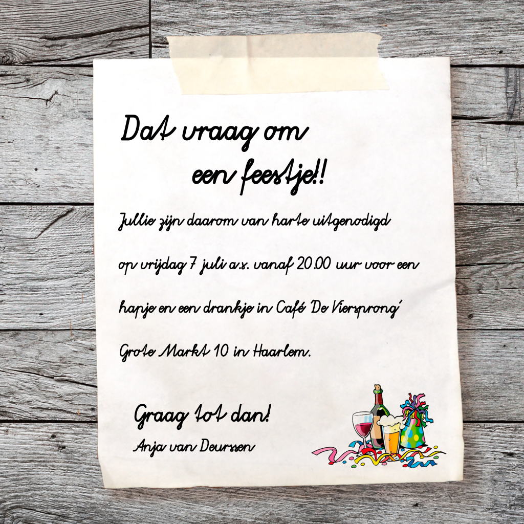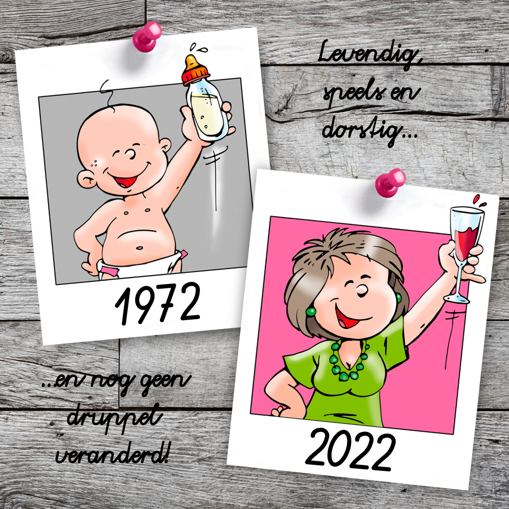 Levendig, speels en dorstig en nog steeds geen druppel veranderd! Ga jij een feest geven voor je 50e verjaardag? Misschien is dit stoere uitnodigingskaartje met houtachtergrond dan iets voor jou. Grappig is de cartoon van een baby en een oudere vrouw met een drankje in hun hand! De binnenkant is vrolijk gepimpt met vellen die als het ware aan het hout vastzitten met punaises en plaktape.