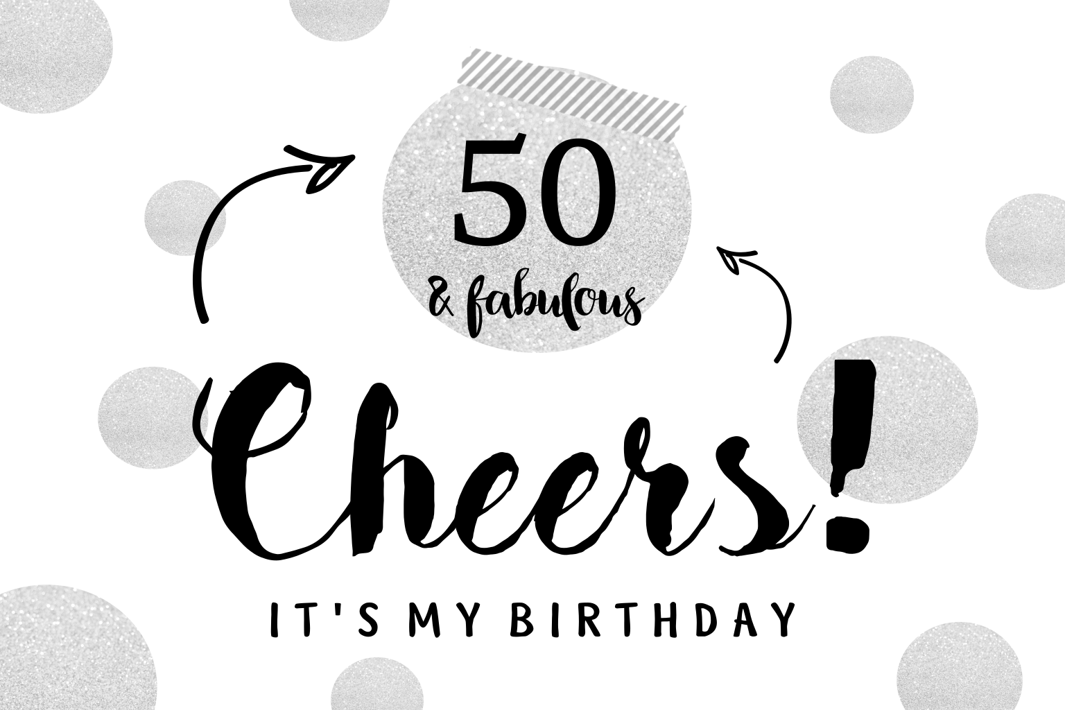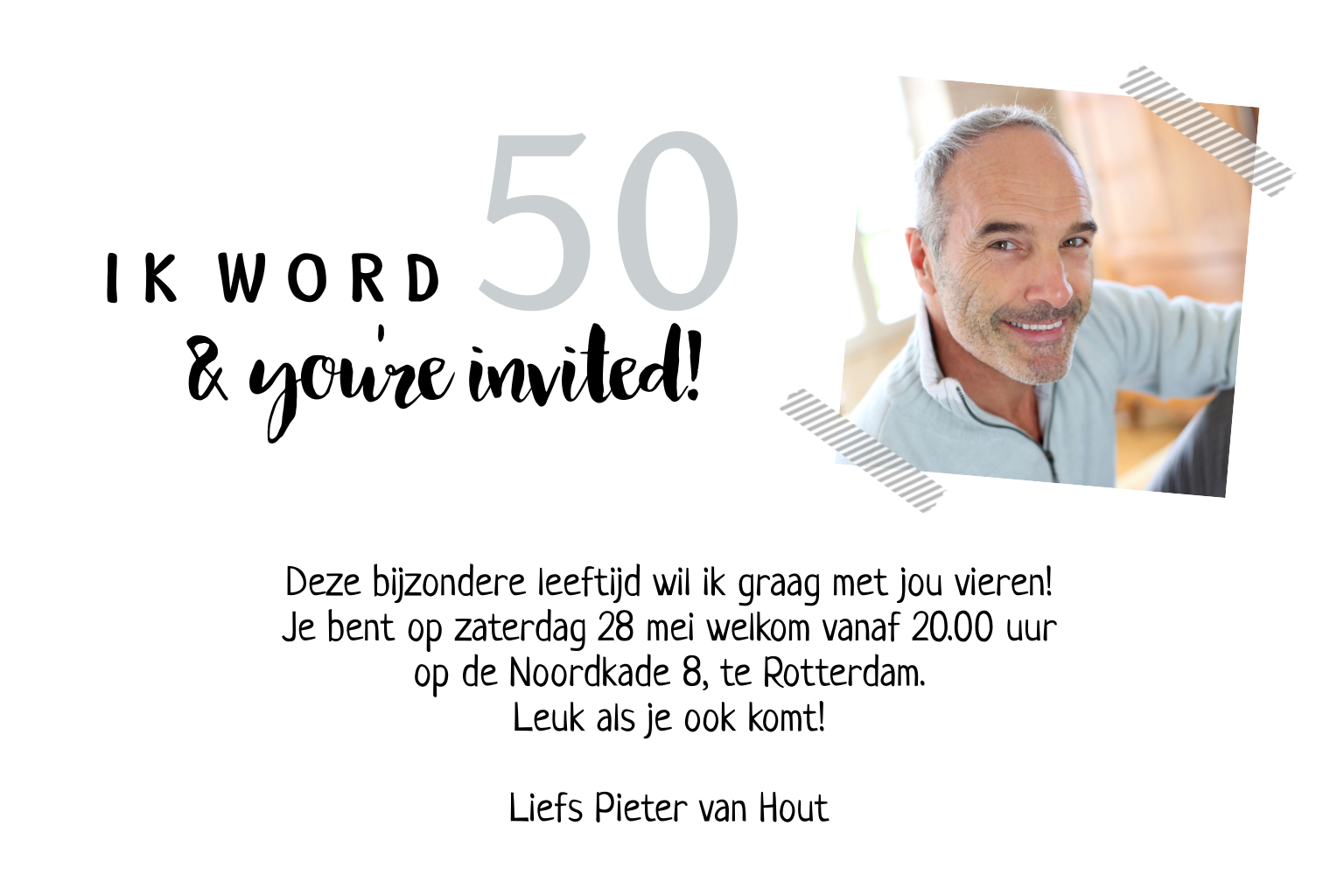 Feestelijke uitnodiging voor je 50e verjaardag met hippe confetti in zilverlook. Verander de teksten, plaats aan de binnenkant je eigen foto en nodig al je vrienden uit!
