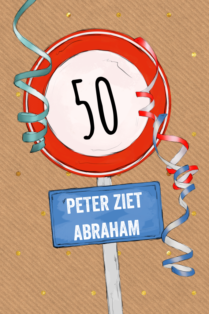 Uitnodiging verjaardag met snelheidsbord met 50 jaar er op. De confetti en serpentine geven de kaart een vrolijke uitstraling.