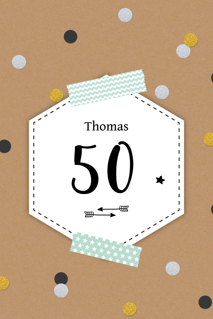 Hippe verjaardagsuitnodiging voor een 50e verjaardag. De kaart heeft een mooie kraftlook achtergrond met goudkleurige, zilverkleurige en zwarte confetti. De naam en leeftijd van de jarige staan in een wit zeshoek met washitape.