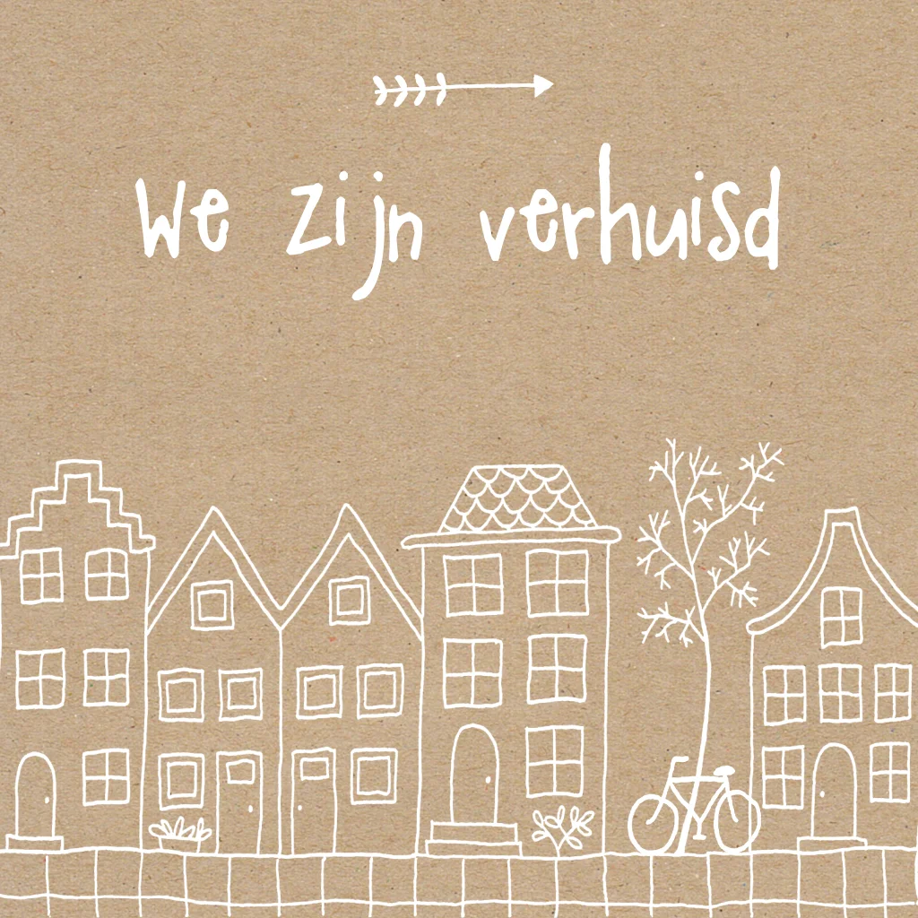 Ben je op zoek naar een verhuiskaart? Wat een leuke kaart met witte huisjes en fiets op een kraft achtergrond. Het nieuwe adres kan makkelijk in de editor aangepast worden.